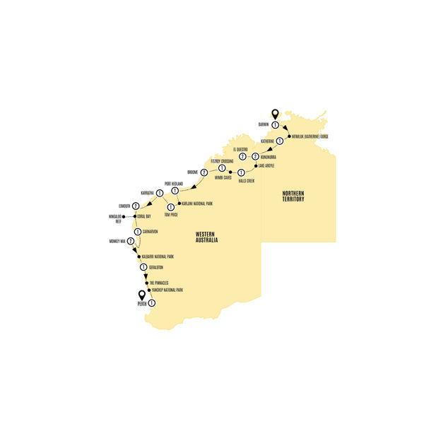 Three weeks of natural wonders, big skies and bucket list moments, all wrapped into one epic road trip. You’ll cover two states, chase gorges and waterfalls, tick off World Heritage sites and soak up the rugged beauty of the Kimberley. Want wildlife You’ve got options, from croc spotting to meeting the famous dolphins at Monkey Mia. Ningaloo Reef brings the chance to swim with whale sharks in season (own expense). Add blazing sunsets, national parks and meaningful Aboriginal and local experiences, and you’ve got a journey that packs a serious punch. This trip is accompanied by a Travel Director and Driver.